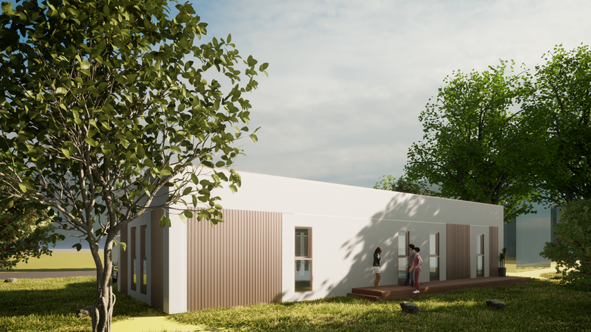 단층이지만 와이드한 평면으로 단층형 주거의 기본형 디자인이다. 적절한 모듈비례로 와이드하면서도 세련된 느낌을 주기 위해 루버 외장재를 차용하였다. 히든 루프 스타일로 더욱 심플하고 간결함을 강조한 디자인이다.